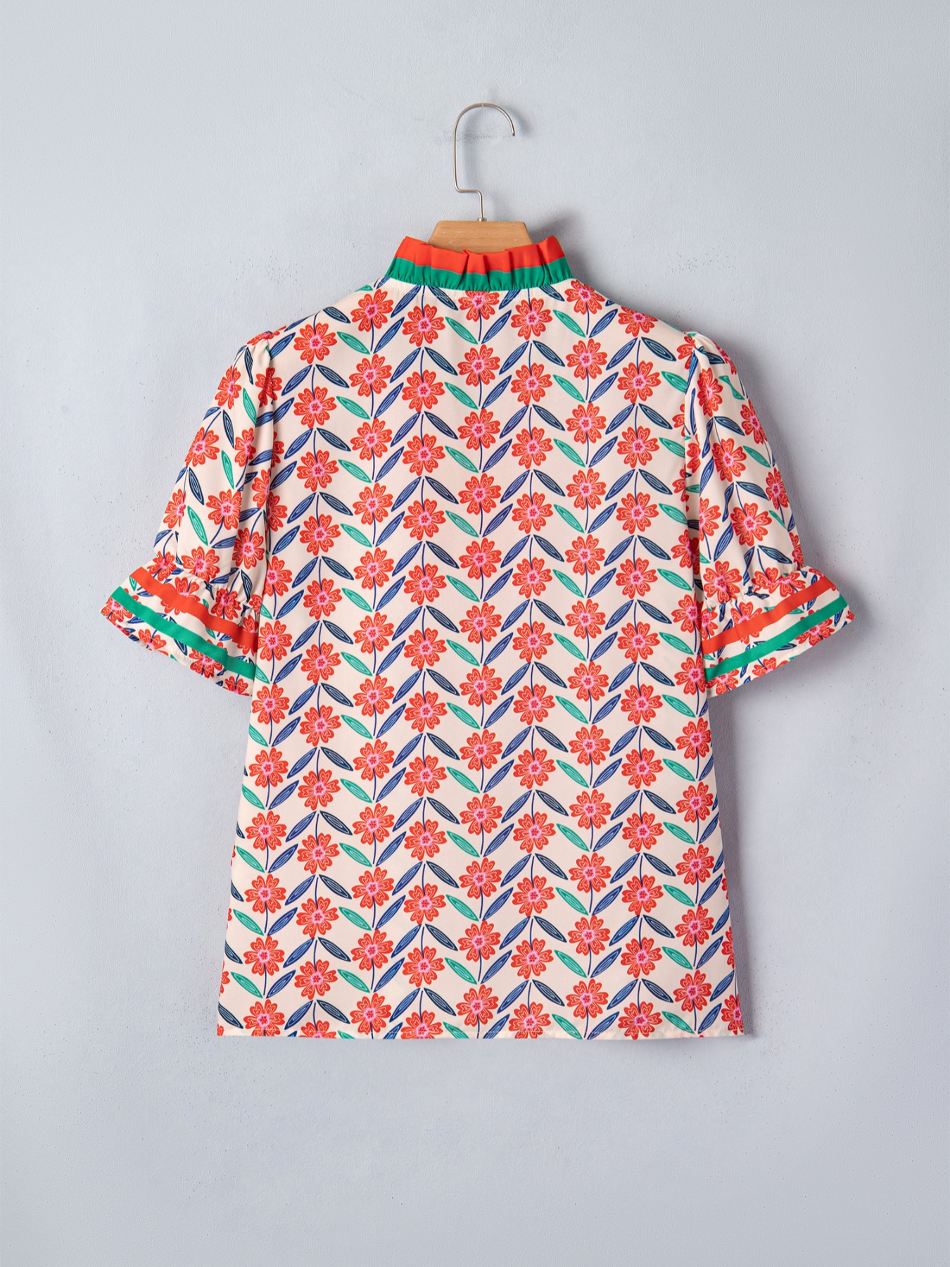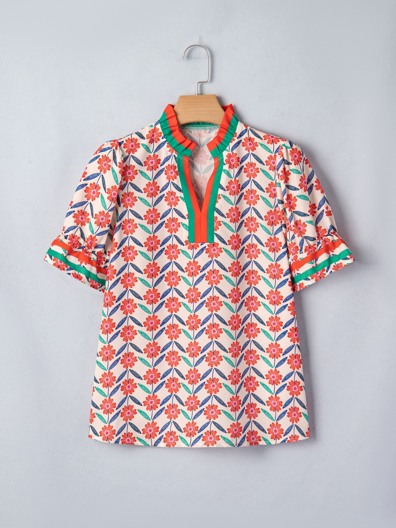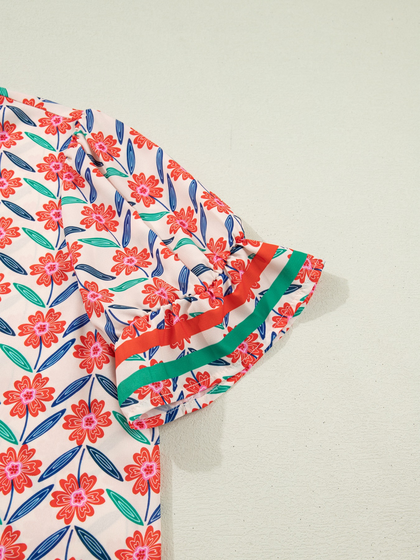 Floral Print Striped Detail V Neck Ruffled Short Sleeve Blouse