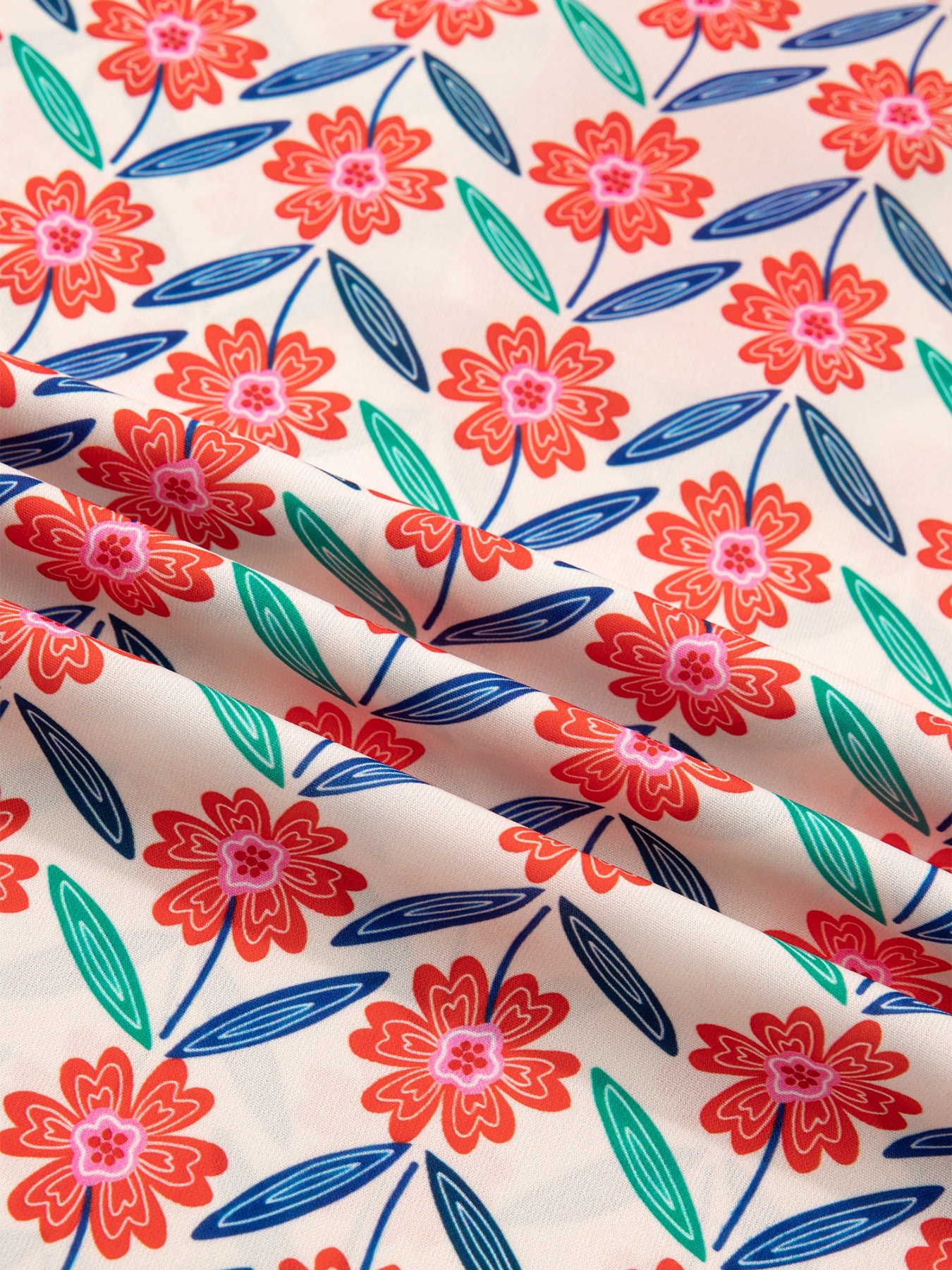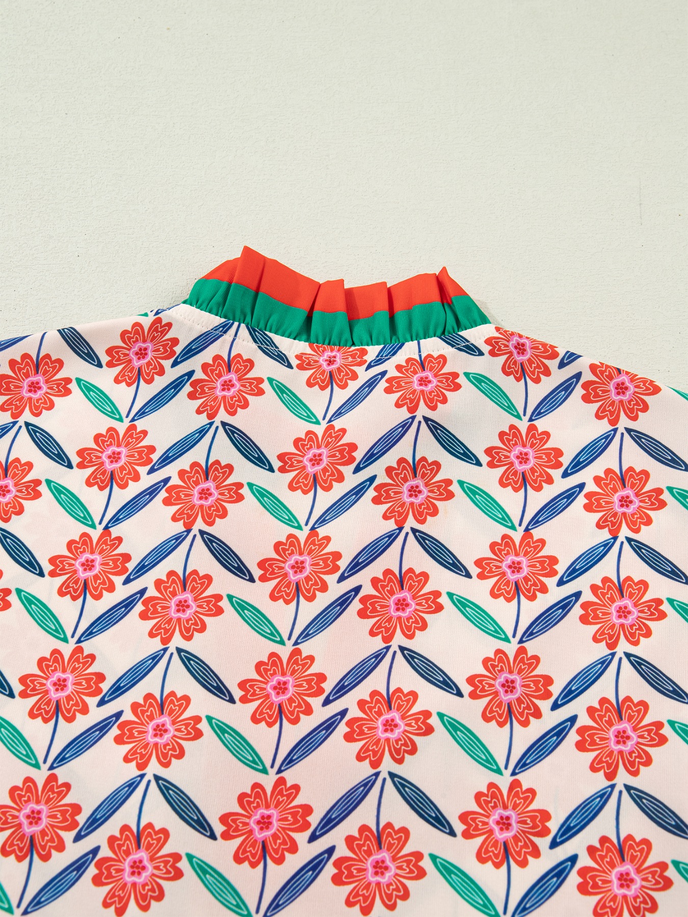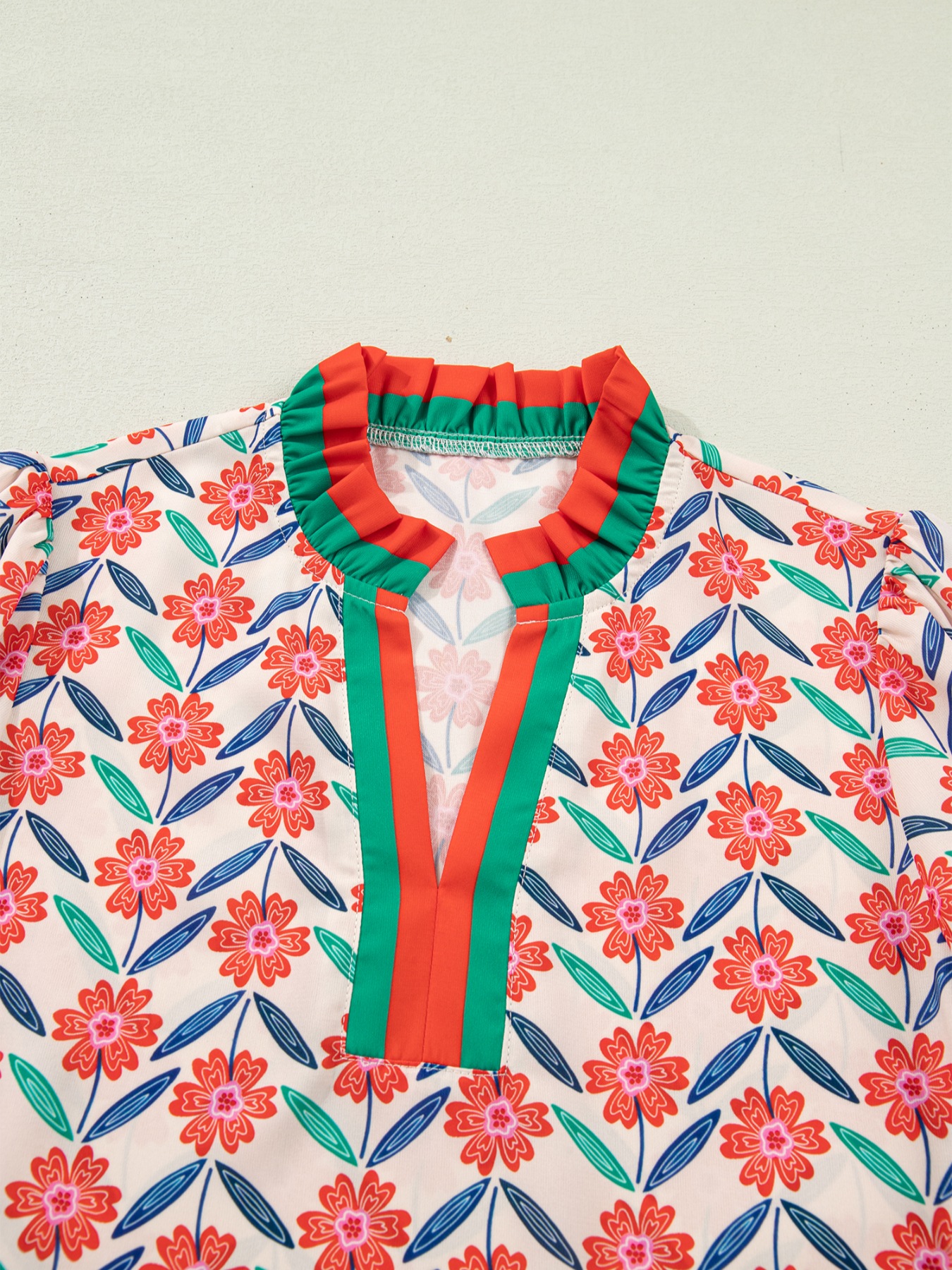 Floral Print Striped Detail V Neck Ruffled Short Sleeve Blouse