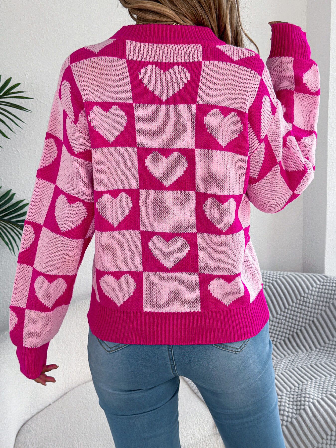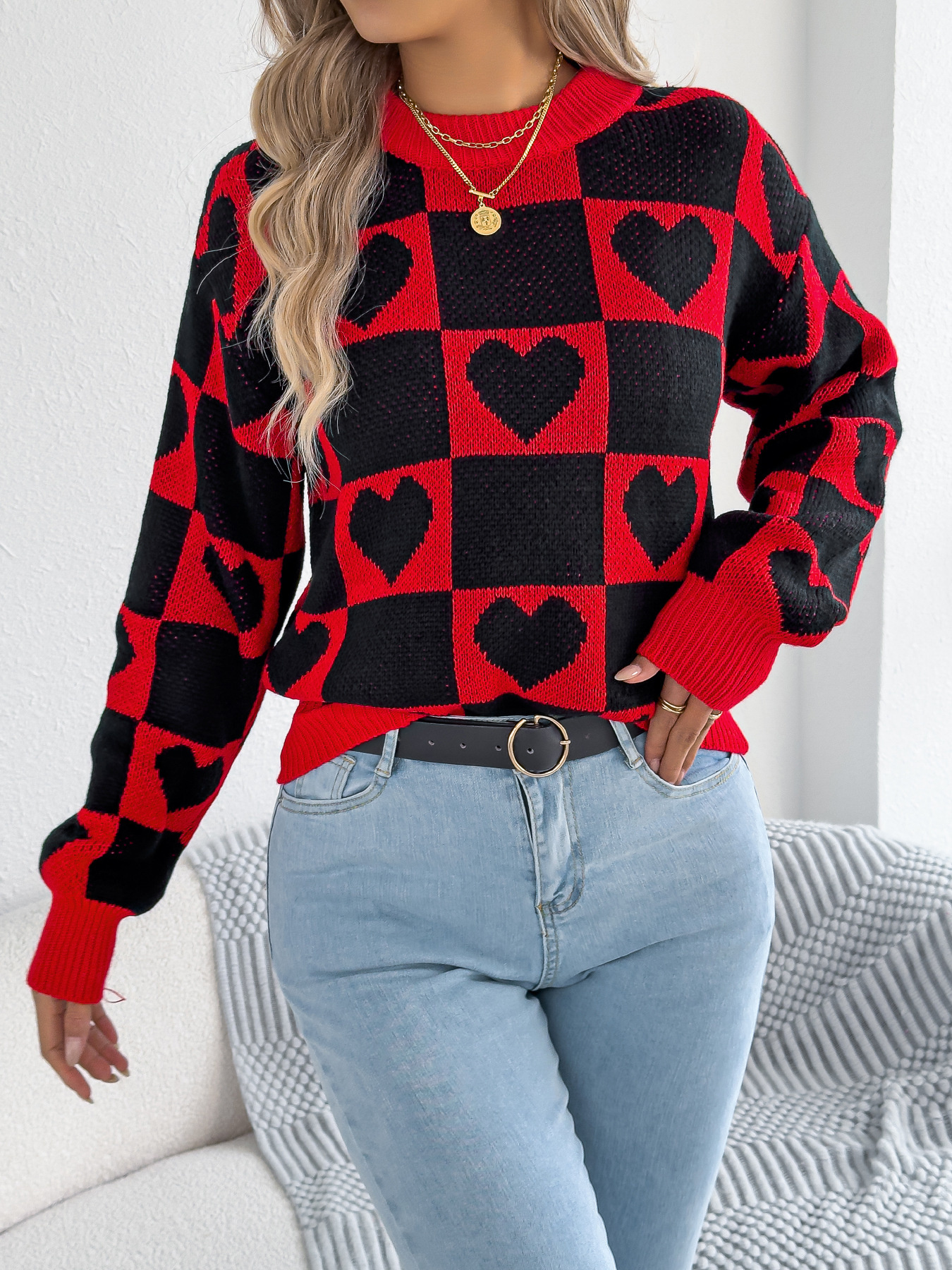 Heart Checkerboard Pattern Round Neck Sweater