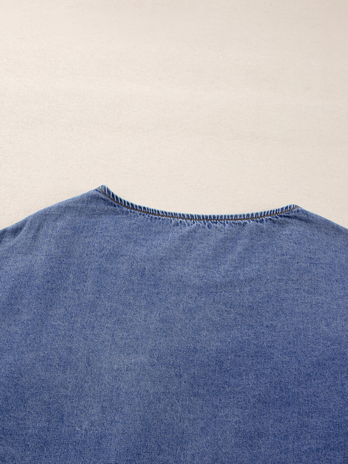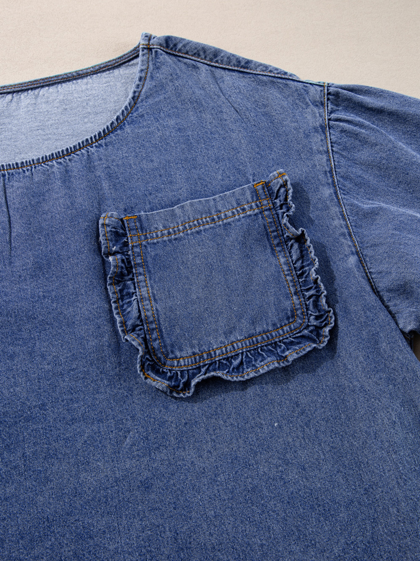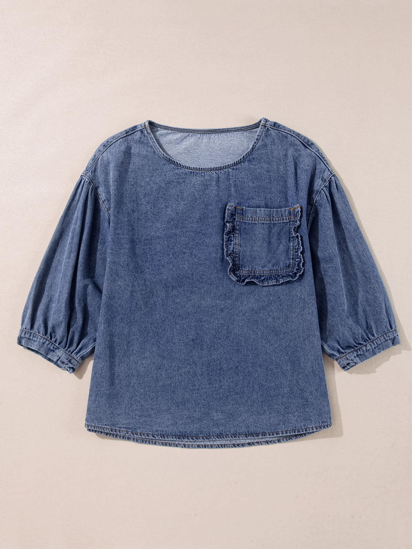 3/4 Sleeve Ruffled Patched Pocket Denim Blouse