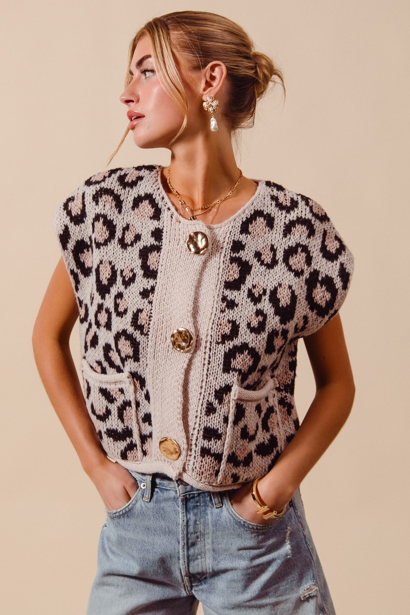 So Me Big Metal Button Front Leopard Sweater Vest Top