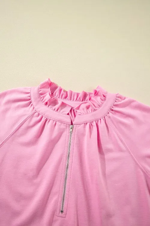 Half Zip Puff Sleeve Top And Ruffled Shorts Set