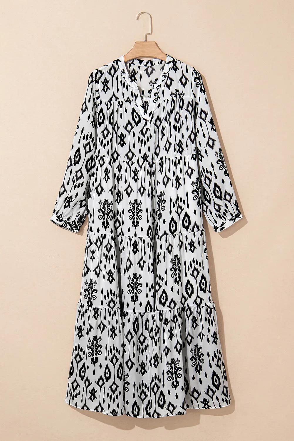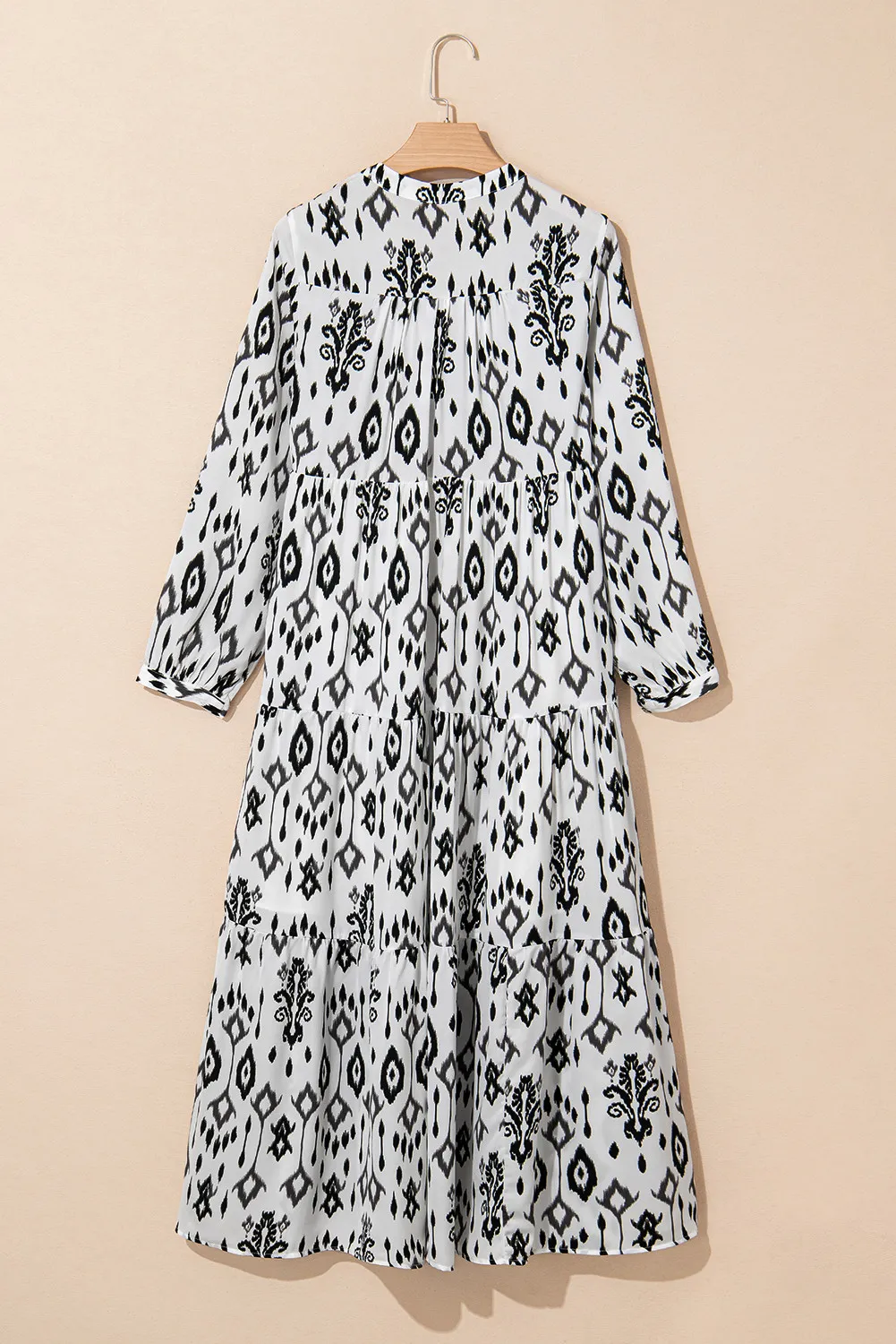 Tiered Printed Notched Long Sleeve Midi Dress