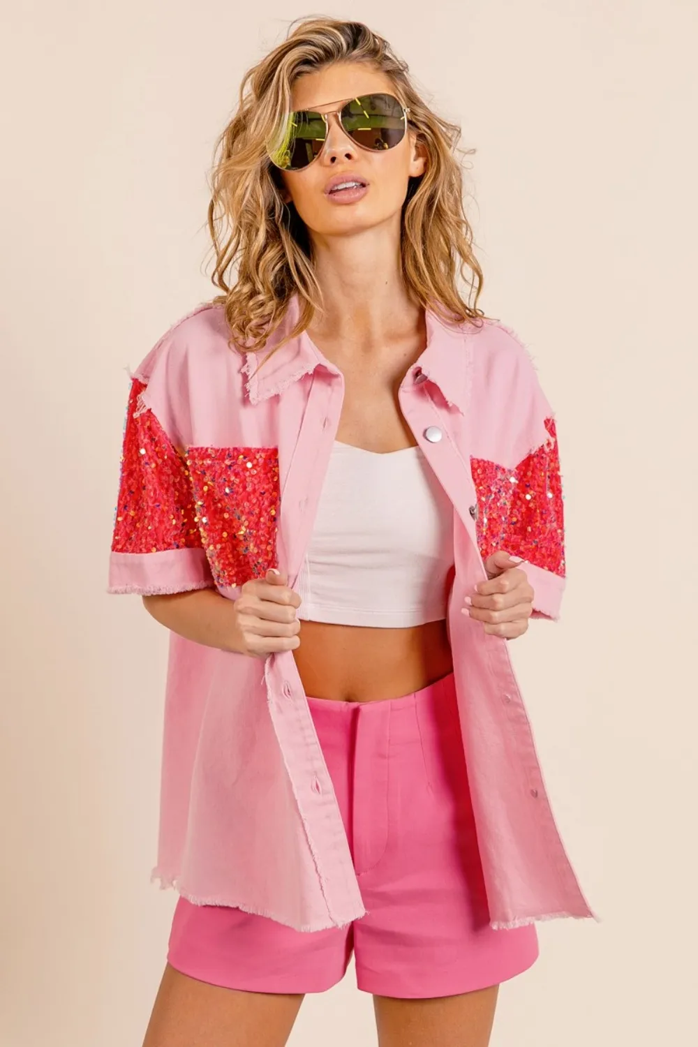 Bibi Sequin Detail Raw Hem Short Sleeve Shirt