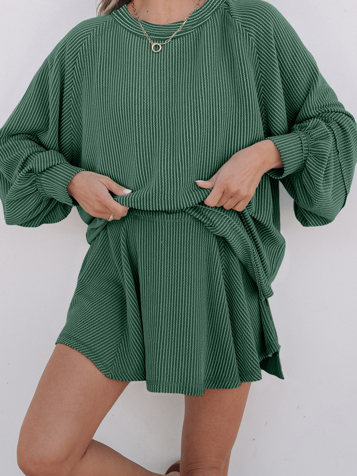 Corded Lantern Sleeve Top And High Waist Mini Skirt Set