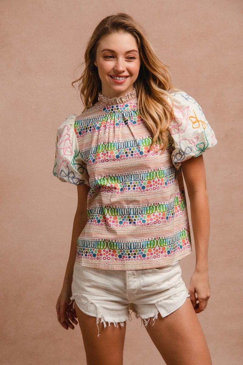 Bibi Ruffle Neckline Blouse With Embroidery Bubble Sleeve